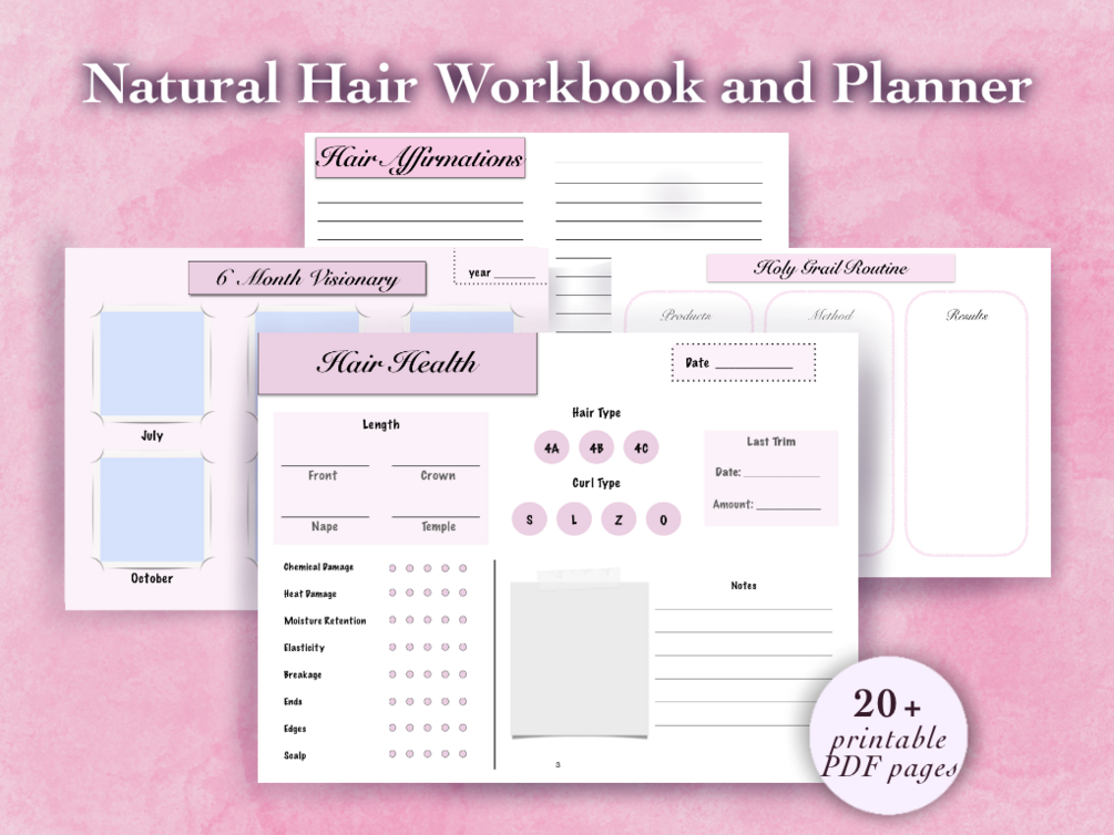 This is an easy to use planner! It’s in PDF format, which allows it to be used on Apple or Android devices, as well as be printed! You can track your goals, protective styles, wash day, and more! There are also journal easy prompts to find more out about your hair!
